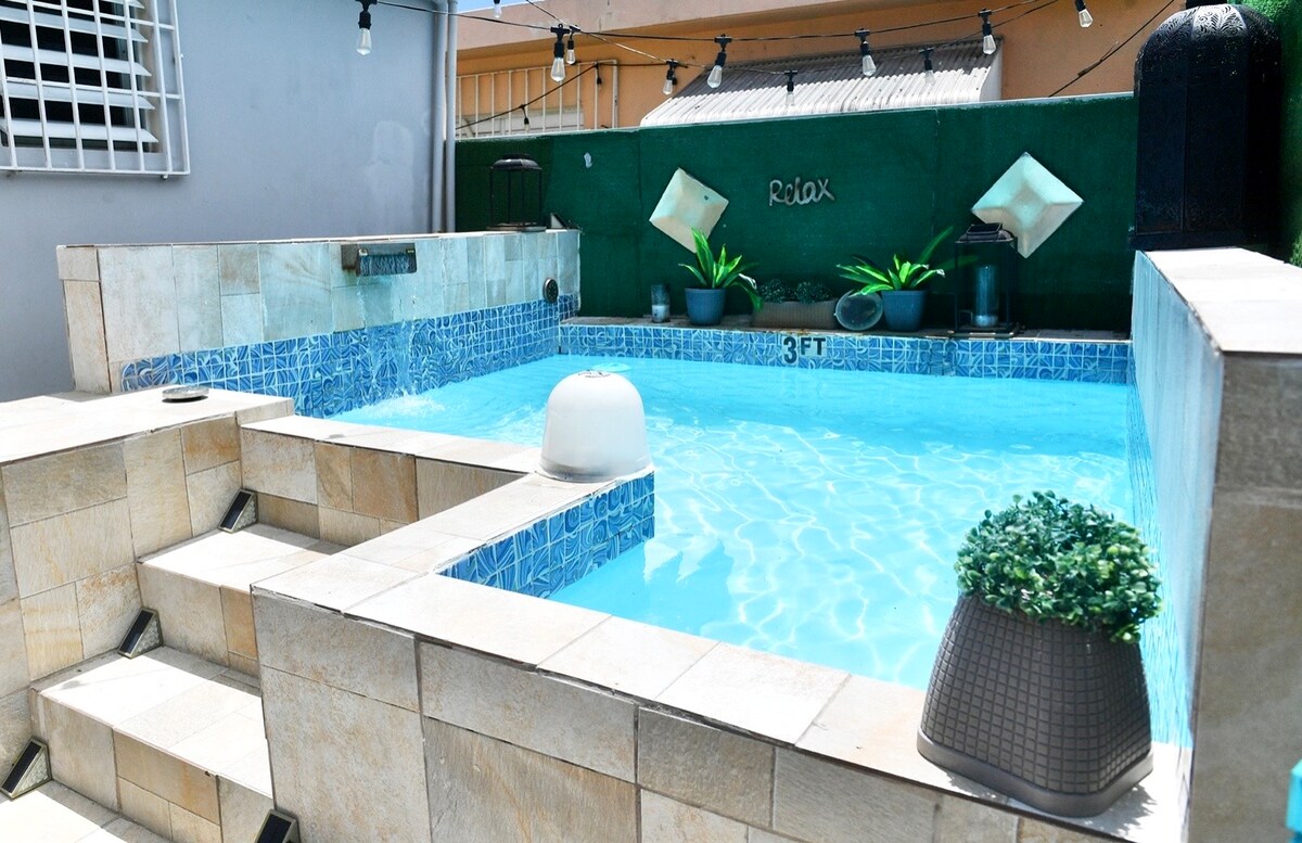 Évadez-vous dans une oasis privée avec un jacuzzi, un foyer et un projecteur intelligent pour des soirées de cinéma inoubliables sous les étoiles. La terrasse ombragée avec barbecue et coin repas est l'endroit idéal pour se détendre. Retraite extérieure🌟 privée avec jacuzzi, foyer et projecteur Soirées 🎬 cinéma sous les étoiles avec un projecteur intelligent Terrasse 🍽 ombragée avec barbecue, coin repas et espaces confortables 🏀 Restez actif avec un mini terrain de basketball Propriété de Boricua!
