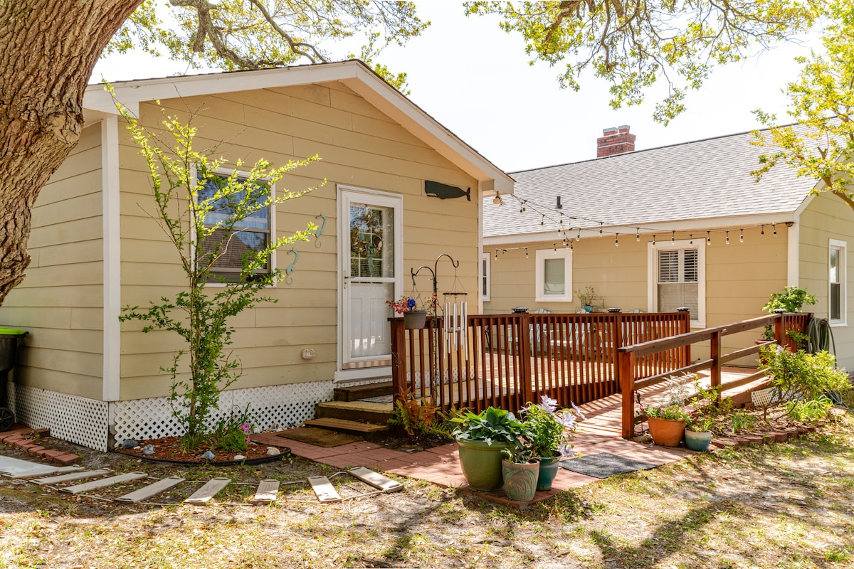 Studio indépendant d'une chambre. Lit Queen Size, canapé double gigogne, kitchenette, lave-linge/sèche-linge, réfrigérateur et grande salle de bains. Télévision 42" avec câble, Roku et WiFi. Deux entrées privées accessibles aux personnes à mobilité réduite, grande terrasse partagée et cafetière Keurig. À distance de marche/vélo du centre-ville de Morehead City, à seulement cinq minutes en voiture de Beaufort et d'Atlantic Beach, ce studio est au centre de nombreuses activités. Pas d'animaux de compagnie s'il vous plaît. Caméra dissuasive non fonctionnelle à l'extérieur des locaux.