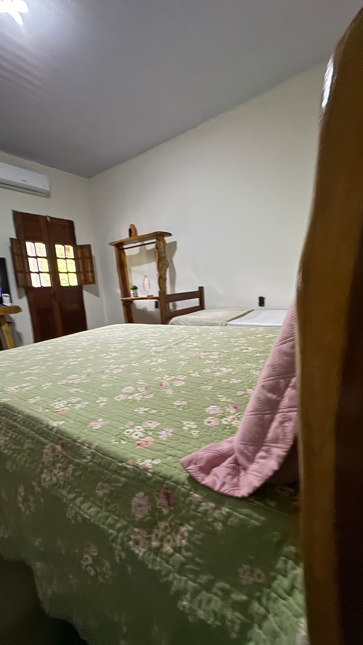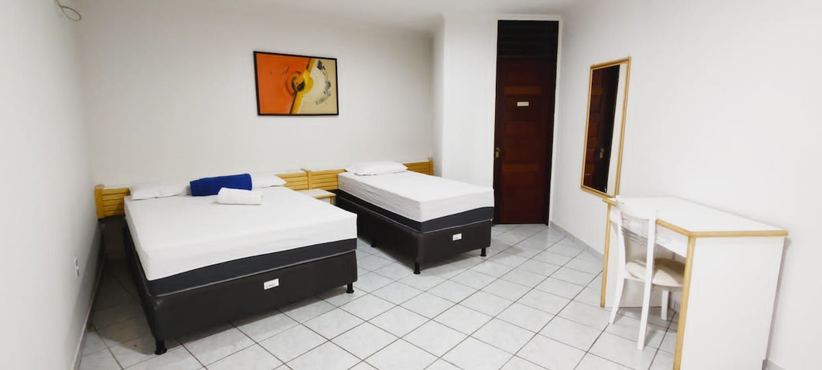 O quarto 102 está equipado com uma cama de casal e uma cama de solteiro, oferecendo versatilidade e conforto para os hóspedes.