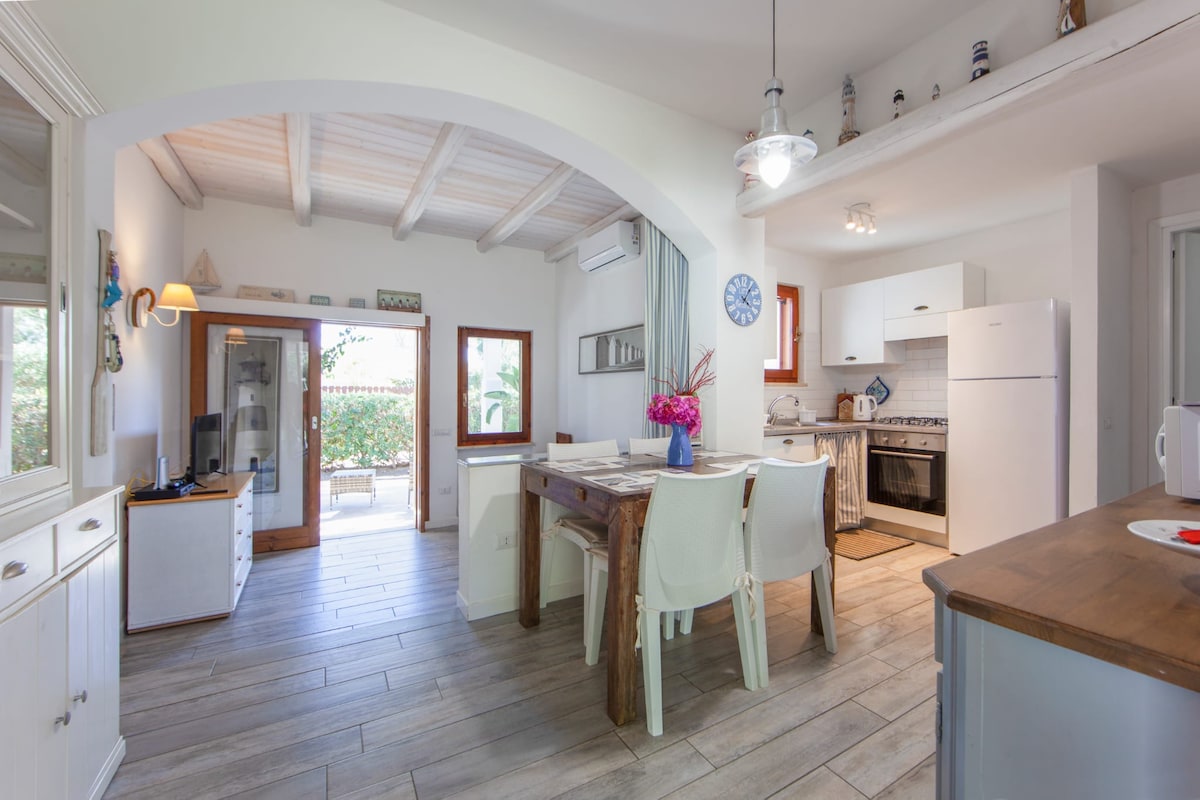 Capo schiera 100 m à pied de la plage. 2 chambres, 1 salle de bain, salon, cuisine ouverte. Patio avant et arrière, douche extérieure. Jardin privé avant et arrière. Parking privé. Marché à 150 m. Climatisation, WiFi. Inclus dans le prix : Linge de lit et de toilette. Frais supplémentaires à payer au moment du départ : Consommation d’électricité 0,40 par Kw/h, Nettoyage final 120,00 euros. Une caution de 300 euros en espèces est demandée à l'arrivée. La caution sera restituée au moment du départ, sous réserve de vérification
