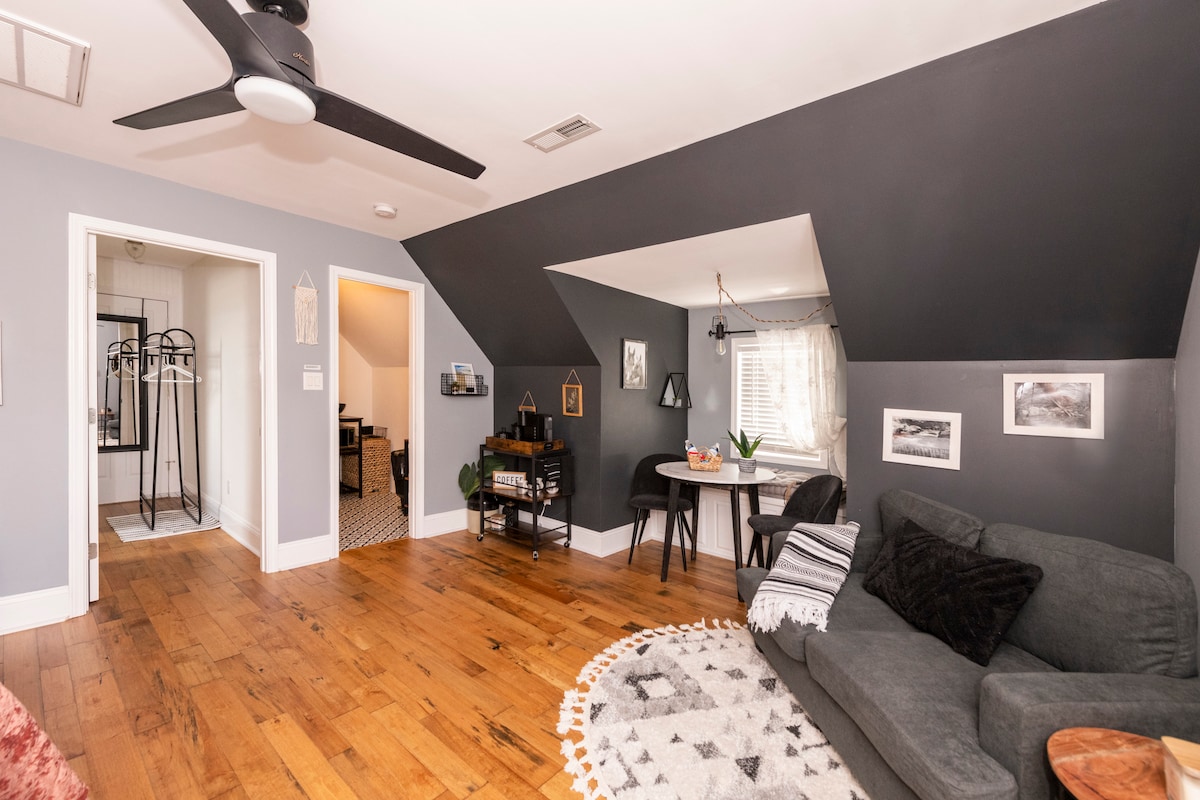 Détendez-vous et sentez-vous comme à la maison dans cet appartement de garage paisible et lumineux parmi les cimes des arbres. Idéalement situé à proximité du meilleur de Wilmington : à 10 minutes en voiture du centre-ville historique et à 15 minutes de Wrightsville Beach ! Bien aménagé avec un lit King Size confortable, de la place pour se détendre dans le séjour spacieux et une cuisine entièrement équipée pour tous vos besoins de cuisine ! Profitez de l'espace partagé de la cour arrière tandis que le stationnement dans l'allée et les hébergements dans la cime des arbres permettent une intimité totale. Faites comme chez vous !