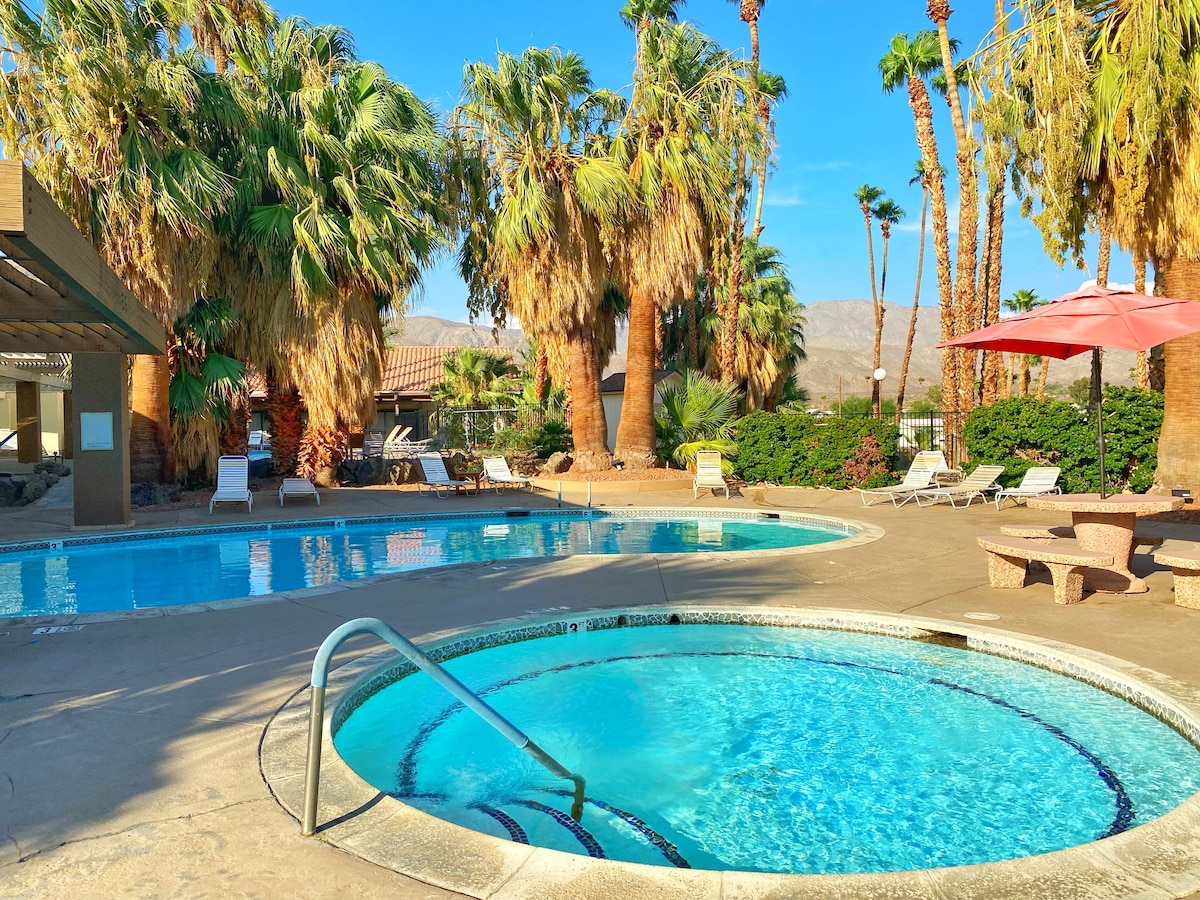 Échappez à l'agitation de la ville et détendez-vous dans la beauté sereine du désert. Après une journée de randonnée, de volleyball aquatique, de pickleball ou de plage ou de l'une des nombreuses activités, détendez-vous et ressourcez-vous dans les piscines minérales apaisantes et les bains à remous. Partez à la découverte des paysages époustouflants du parc national de Joshua Tree, à seulement 40 minutes. Pour un avant-goût du charme de la ville, rendez-vous à Palm Springs, à 20 minutes, pour dîner, magasiner et visiter des musées. Vous pouvez aussi simplement rester sur place et profiter de la tranquillité au bord des piscines et des spas. Le choix vous appartient.