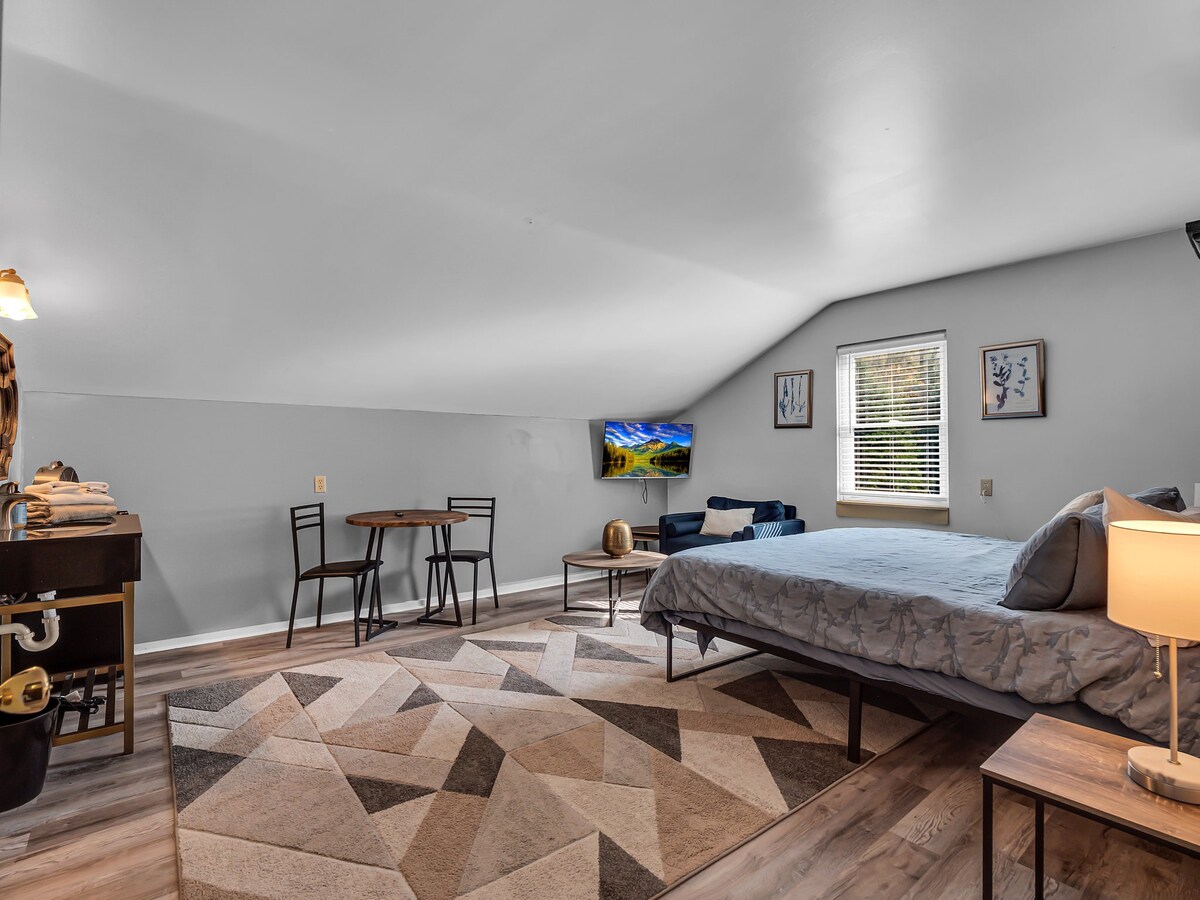Edelweiss Ski Lodge offre l'un des meilleurs emplacements à Ellicottville. Niché au cœur du centre-ville, il est à distance de marche des magasins, des restaurants et de la vie nocturne, tout en conservant une atmosphère paisible de cabane en bois. Les skieurs adorent sa proximité avec Holiday Valley et Holimont, tous deux à quelques minutes. Les attractions locales comme la Ellicottville Brewing Company et la Winery of Ellicottville sont également à proximité, ce qui en fait un favori toute l'année. Ce chalet est une suite nuptiale avec un jacuzzi!