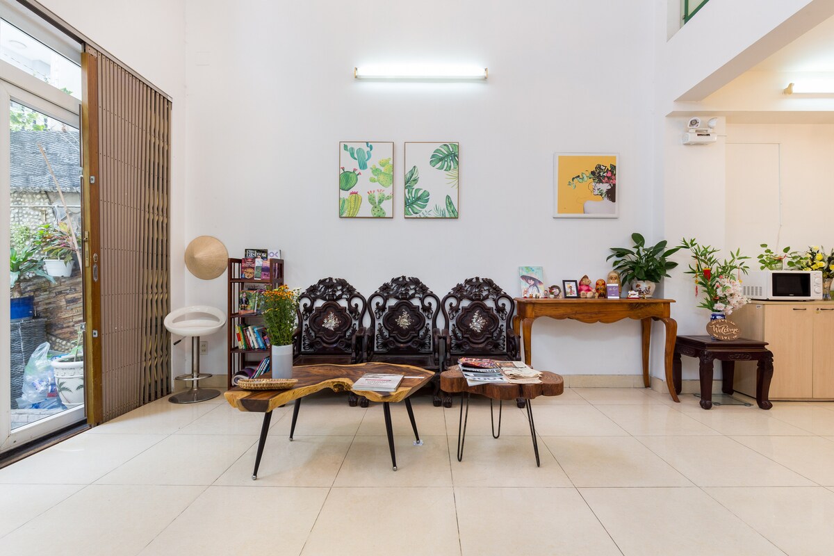 Studio au design unique situé dans une jolie ruelle du Saigon Center. Le studio est situé au 2e étage d'une maison de ville, dont le 1er étage est le charmant café BeanThere. Il ne faut que quelques minutes pour se rendre aux attractions et aux activités nocturnes. En outre, il y a également une cuisine pour cuisiner des repas de base. Un petit déjeuner (01 nourriture et 01 boisson) / invité / nuit dans le café Beanthere. Nous offrons un service de ménage gratuit pour les réservations de plus de 4 nuits. Si nécessaire, vous pouvez nous en informer 1 jour à l'avance.