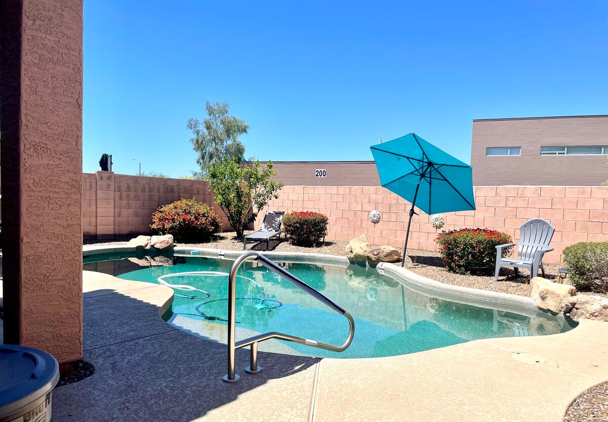 Le Desert Escape est une maison confortable et tranquille où l'architecture traditionnelle de Cave Creek rencontre les commodités modernes dans le quartier local le plus charmant. Détendez-vous au bord de la piscine, plongez dans le jacuzzi et profitez des magnifiques jardins désertiques. Avec Black Mountain à quelques pâtés de maison, c'est un point de départ pratique pour une randonnée matinale. Marchez jusqu'au Local Jonny's pour un café le matin ou de la musique le soir. Le Tonto Bar & Grill est tout aussi proche que tous les magasins amusants et autres restaurants de cette charmante ville.