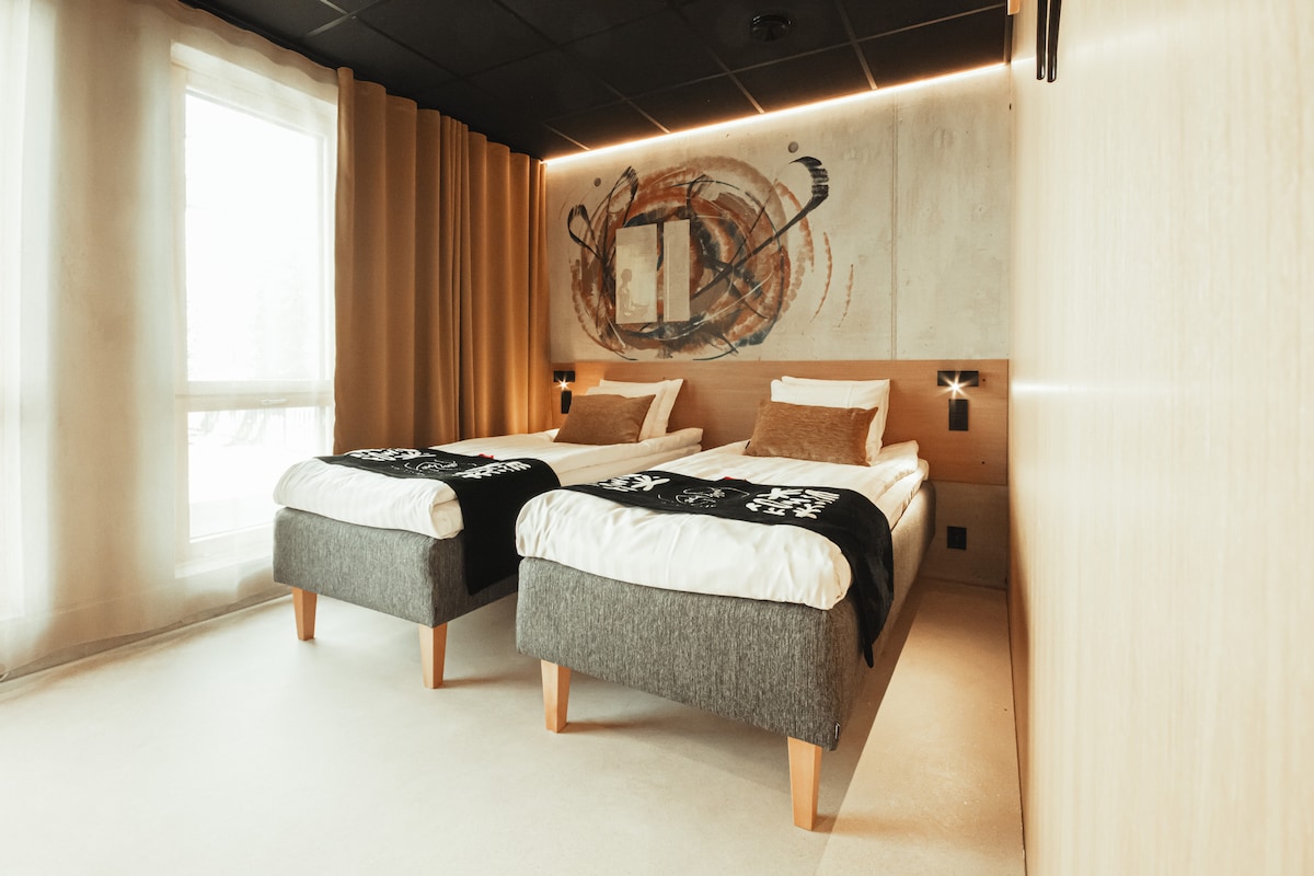 Tempo is the hotel’s smallest room, suitable for 1-2 guests. The room features two separate beds, a workspace, and a private bathroom.
