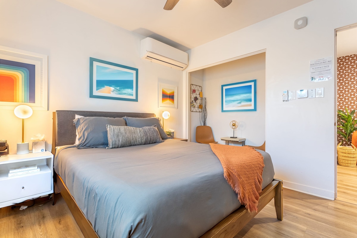 Une entrée séparée est un portail vers un luxueux chalet moderne indépendant dans un jardin clos et isolé. Les portes coulissantes en verre donnent sur l'étang de nénuphars et les colibris. La chambre ombragée dispose d'un sol en liège pour un confort tranquille et d'une porte coulissante en panneaux de bois. La salle de bain dispose d'une douche avec des fenêtres givrées du sol au plafond, et il y a une terrasse arrière privée. Cette suite moderne contemporaine présente des couleurs vives et des œuvres d'art partout. FILTRATION DE L'AIR HEPA 24 H/24.