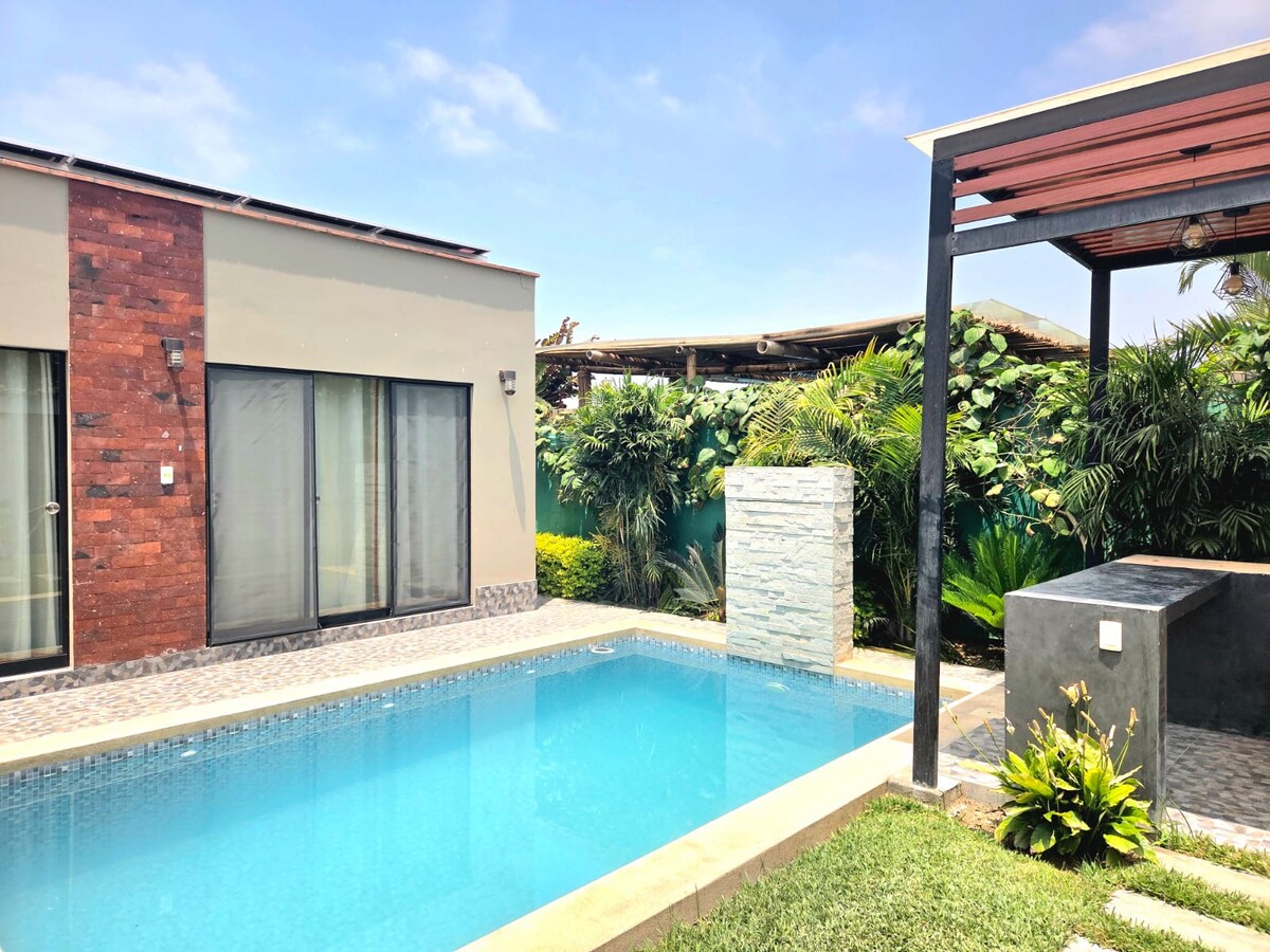 HAPPY HOUSE. Excellente maison de campagne spacieuse neuve avec toutes les commodités à 5 minutes du boulevard d'Asie et de la plage de Bujama, pour passer un week-end de détente, familial et amusant loin de l'agitation et du stress de la ville. Espace barbecue, piscine, grande cuisine pour vos plats préférés, chambres confortables et élégantes comme vous le méritez. Ainsi qu'une belle lagune et des espaces verts. La maison dispose de 700 m2 et de 4 garages.