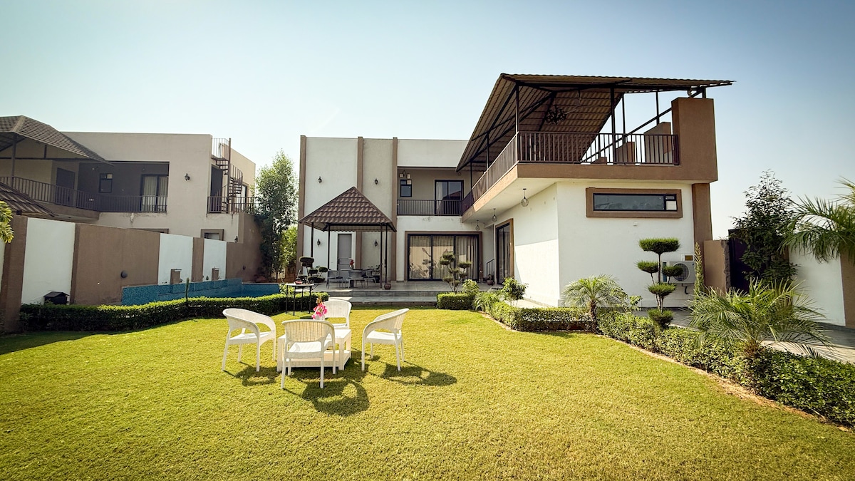Niché dans un quartier résidentiel calme de Jagatpura, Aarrunya est un choix parfait pour les séjours en famille, les lunes de miel confortables, les vacances relaxantes entre amis et les retraites contemplatives en solo. Son design rustique moderne est évident dans les murs de briques apparentes et les grandes fenêtres orientées à l'est, qui imprègnent la maison d'une lumière naturelle brillante. Dans la pelouse parfumée, des papillons blancs flottent autour des cerisiers nouvellement plantés, et le chant joyeux des oiseaux peut être entendu toute la journée.