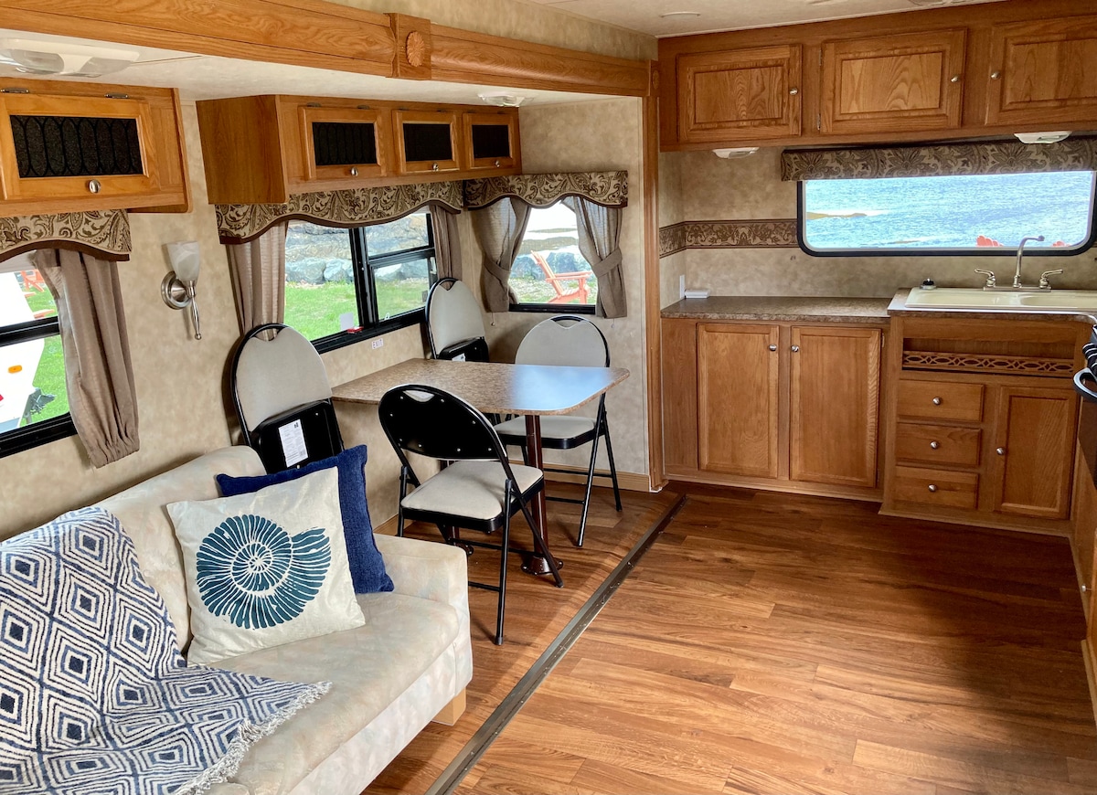 Ressourcez-vous avec le magnifique paysage de la baie des chaleur. Cette caravane vous offre un lit King et un sofa lit. Une terrasse avec Bbq et table de patio. pour terminer votre soiree avec un feu dans votre fire pit
