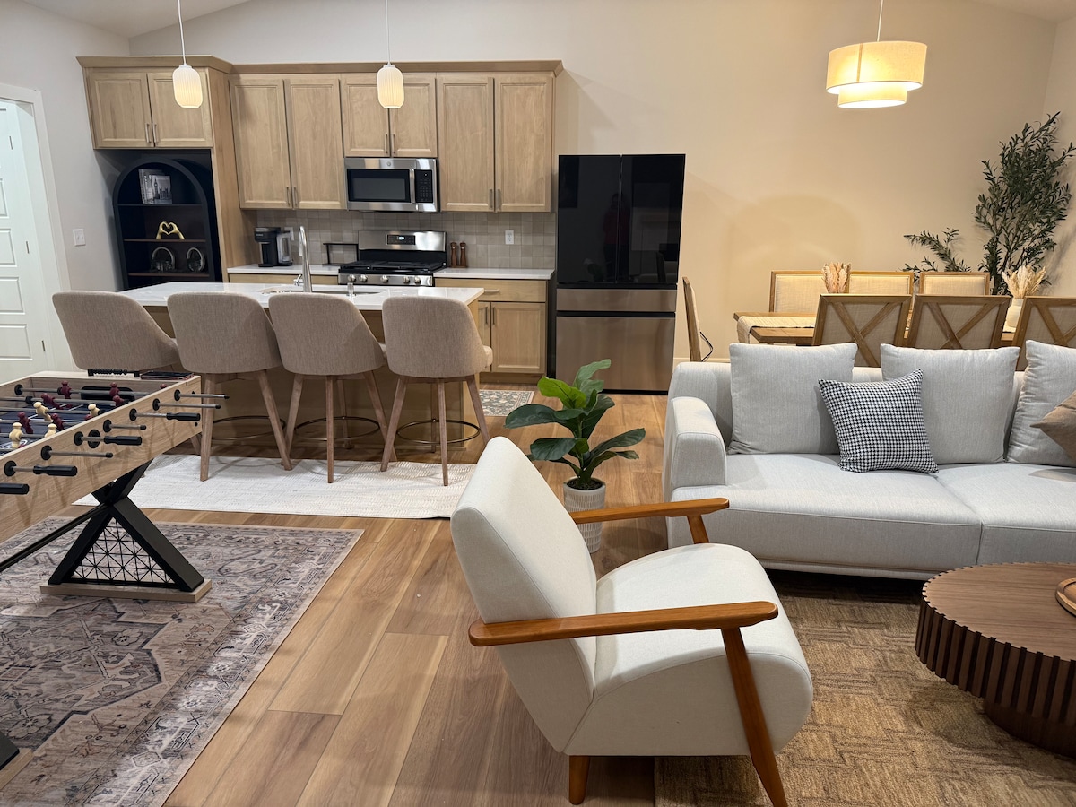 Profitez d'un séjour confortable et douillet dans notre maison de ville nouvellement construite en 2025, parfaite pour les familles et les groupes, à 3 minutes de l'UIUC La maison dispose de commodités modernes et haut de gamme et d'un design propre et élégant. Pour dormir, il y a un très grand lit et deux grands lits qui peuvent accueillir confortablement six voyageurs. Un matelas gonflable deux places est aussi disponible pour un maximum de huit voyageurs. Profitez d'appareils haut de gamme, y compris un réfrigérateur Samsung Bespoke, un lave-linge/sèche-linge tout-en-un Samsung Bespoke, une machine à café Keurig K-Crema, une télévision de 85 pouces, etc.