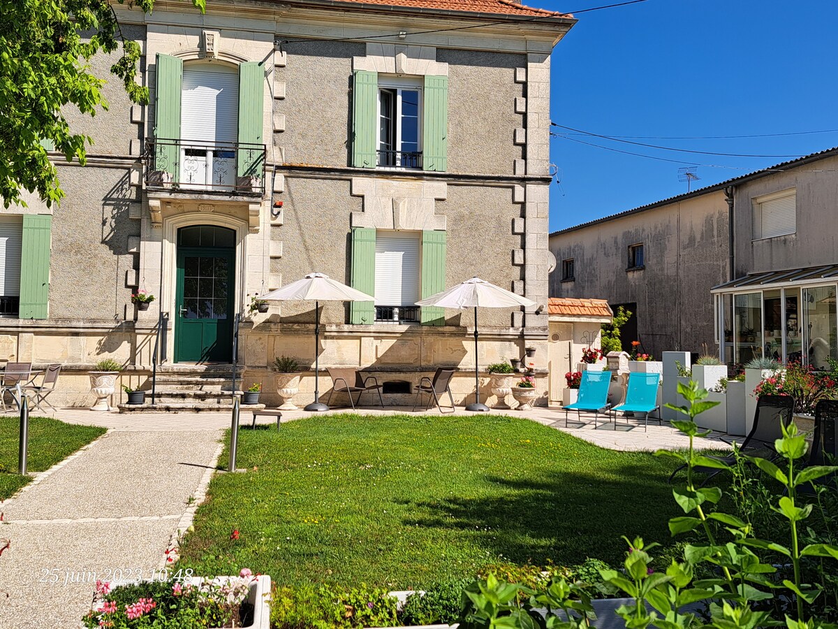 Belle maison charentaise de 180 m2 avec grande terrasse en bois, piscine privative chauffée (selon météo), appentis et jardin clôturé de 500 m2 à 5 km de Saintes, 20 km de Cognac et 40 km des plages. 5 chambres dont une suite parentale avec salle d'eau privative, une salle de bains comprenant douche, baignoire et double-vasque. 2 WC, une buanderie, une mezzanine. Grande terrasse en bois, piscine 8x4, table, chaises, salon, transats et barbecue. Linge de lit fourni. Les WE départ le dimanche 16 h