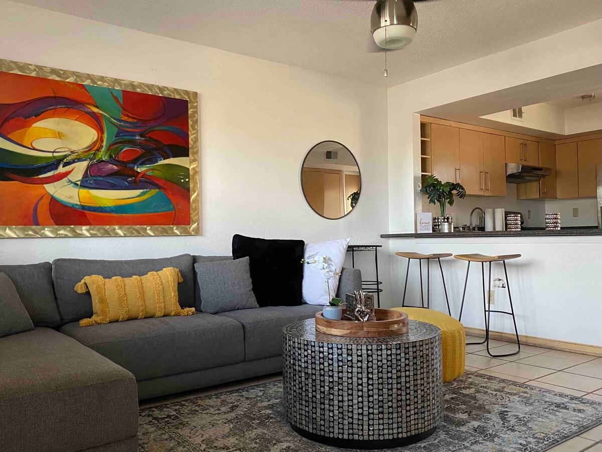 Appartement confortable et joliment décoré d'une chambre avec lit King Size et canapé-lit. Hôpitaux proches, UTEP, stade de baseball de Chihuahua et quartier des divertissements du centre-ville. À 4 pâtés de maisons de l'I-10. À 4 pâtés de maisons du nouveau système de tramway et des arrêts de bus. Quartier résidentiel plus ancien calme et sécurisé au cœur de la ville. Internet, télévision connectée, cuisine avec cuisinière, micro-ondes, cafetière et réfrigérateur. Le logement est équipé d'un refroidissement par évaporation ainsi que d'un climatiseur réfrigéré supplémentaire dans la chambre.