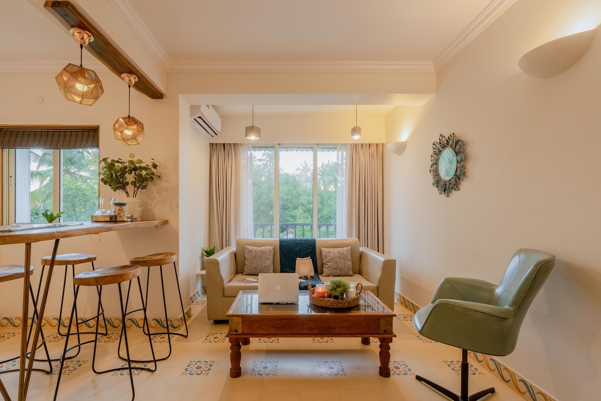 Piscine ☆ privée directement sur votre balcon ☆ Situé à côté de toutes les grandes plages du nord de Goa. Plage de☆ Calangute à 6 minutes 🛵 Plage de☆ Candolim à 13 minutes Plage de☆ Vagator à 25 minutes Plage d'☆Anjuna à 25 minutes ⇒ Accès facile aux deux aéroports Quartier ⇒ paisible ⇒ Parfait pour le télétravail. Comprend un bureau et une connexion Wi-Fi par fibre. ⇒ Grand espace de stationnement pour les voitures et les vélos. ⇒ Capacité d'accueil de 4 adultes. Mobilier ⇒ haut de gamme, argenterie française, 1 lit king size et 1 canapé-lit queen size. Télévision connectée⇒ 55 pouces, PlayStation et haut-parleurs Marshall.
