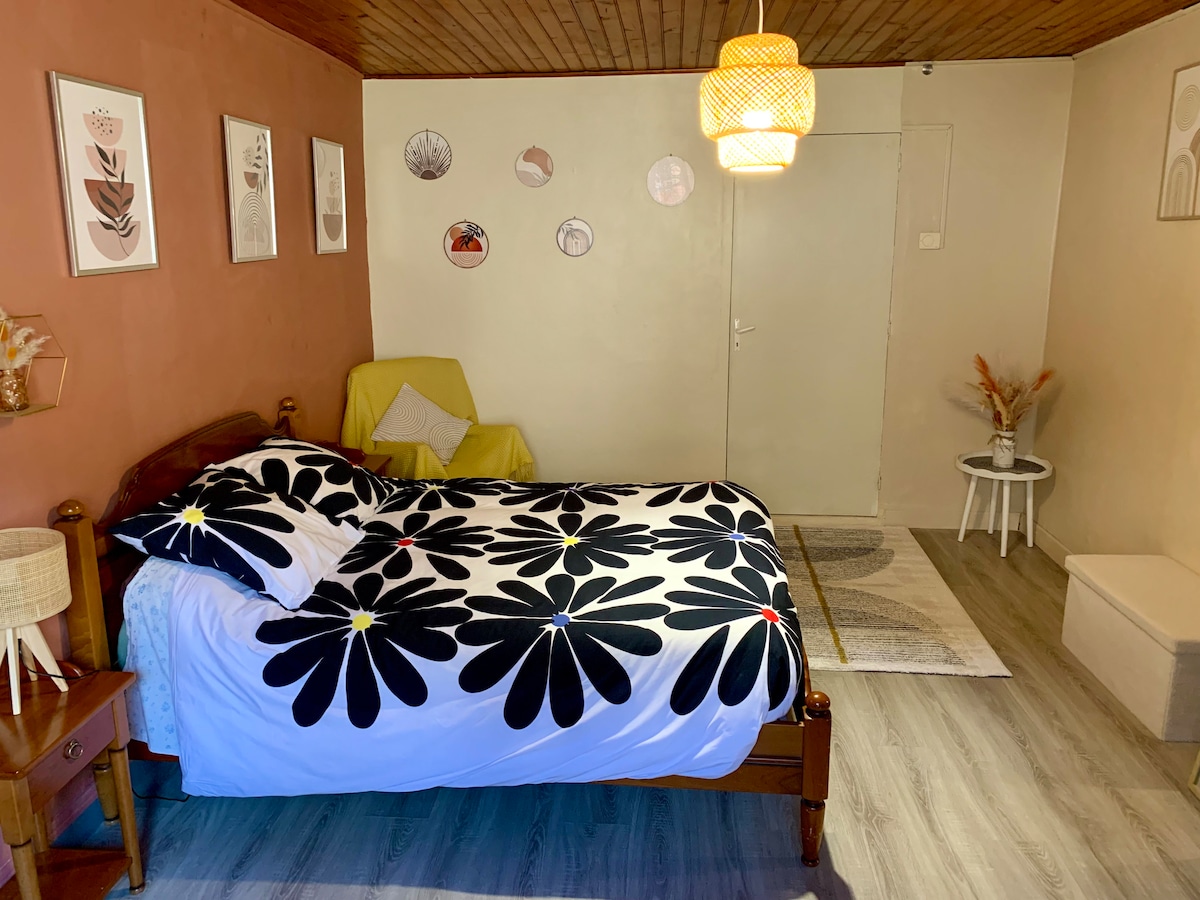 Bienvenue, notre logement dispose d'une chambre avec un lit deux personnes et possibilité d'ajouter un lit pour Bébé ou un lit de 90, possibilité également de recevoir un ou deux enfants ou ados (canapé convertible). Une cuisine aménagée (micro-ondes, bouilloire, machine senseo), un salon-s. à m., sdb avec douche, un grand jardin partagé, terrasse avec table pour des repas à l'extérieur, ... Nombreux lieux touristiques à moins de 15 kilomètres du logement. Lieux de baignade et randonnées