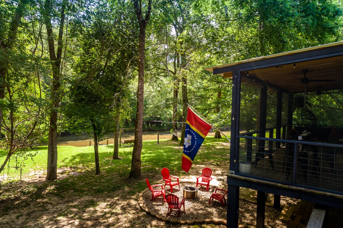 Bienvenue dans notre confortable petite cabane nichée sur 32 acres de paisibles forêts du Mississippi, avec un accès direct à la magnifique rivière Bogue Chitto. Sortez de chez vous et entrez dans des kilomètres de forêt, passez la journée à faire du kayak ou à pêcher sur la rivière, puis détendez-vous près du foyer sous un ciel plein d'étoiles. Que vous soyez à la recherche de solitude, d'aventure ou d'une détox numérique, cette retraite vous offre tout ce qu'il vous faut. Il n'y a pas de prise de vue ou de VTT autorisé dans le logement. MERCI DE NE PAS CONDUIRE VOS VÉHICULES SUR LES SENTIERS NON PLUS !