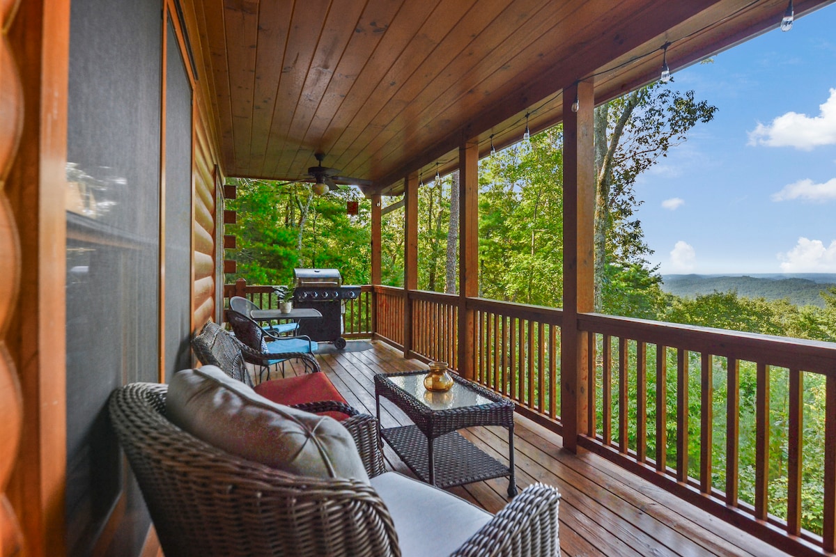Imaginez-vous en train de conduire sur une route de montagne sinueuse, entourée d'arbres. Près du sommet, votre cabane rustique en rondins de bois surplombe de magnifiques vues sur les montagnes. Vous pouvez respirer. À l'intérieur, un salon spacieux avec un mobilier confortable, une télévision grand écran et une cheminée confortable. Une vaste terrasse couverte vous invite avec des vues merveilleuses. Explorez les bois, préparez un repas sur le gril ou détendez-vous dans le jacuzzi. Près des sentiers de randonnée/VTT, vous êtes loin de la foule, mais à seulement 9,5 miles du centre-ville de Blue Ridge.