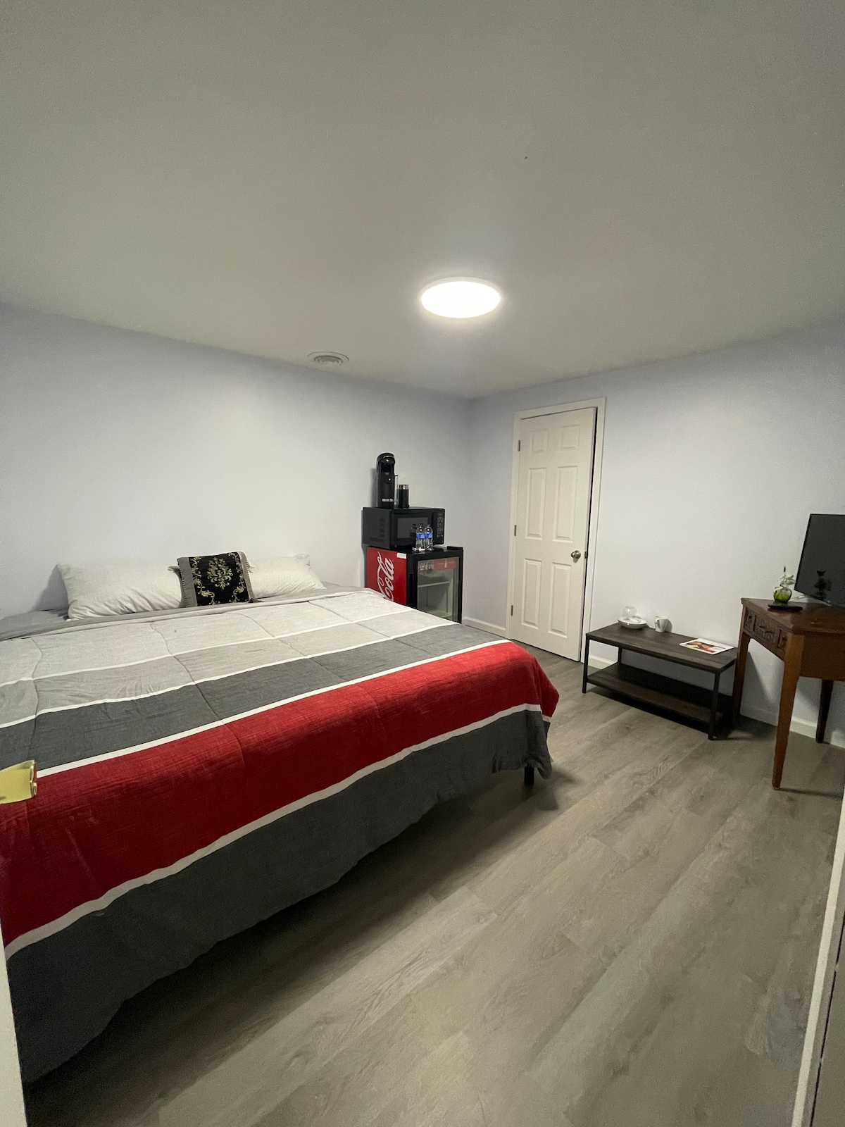 Notre maison se trouve dans un quartier très calme et sûr. Lorsque vous séjournerez chez nous, vous entrerez par le sous-sol. Vous avez pleinement accès à notre appartement très privé en bas. Cela vous mènera directement dans le très grand séjour. La chambre principale est équipée d'un lit King Size, de rideaux occultants et d'un placard. Une salle de bain avec douche à l'italienne est attenante. Les équipements comprennent la télévision, un lecteur DVD, une connexion Wi-Fi, une machine à café Kuerig, un mini-réfrigérateur et un accès au patio/porche avec foyer dans la cour arrière.