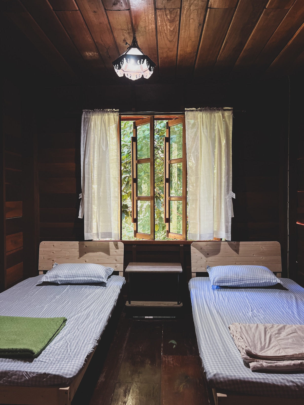 Maison en bois de deux étages entourée d'arbres fruitiers. Nichée à côté de notre studio d'art, la cuisine au rez-de-chaussée offre un espace pour cuisiner ensemble. Monter les escaliers révèle une connexion naturelle avec un balcon ouvert. Avec une chambre ouverte au vent, restez près de l'étreinte de la forêt toute la journée. Au crépuscule, lorsque le temps est frais, nous nous asseyons autour du feu de joie, laissez nos cœurs se réchauffer. Écoutez les étoiles éternelles, béni l'énergie de MotherNature (Pachamama) et Doi Luang ChiangDao