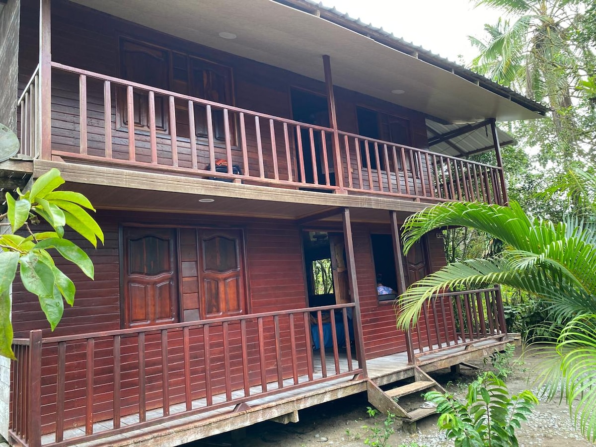 Chalets à San Francisco, Chocó, au cœur de la jungle, près de la mer et de la plage. Capacité de 8 personnes, avec 5 lits, une cuisine, un réfrigérateur et un grand balcon. À 200 m de Río Ciego, idéal pour profiter de l'eau douce et de la nature. Parfait pour les randonnées, l'observation de la faune, les visites de mares et d'arbres géants, et pour voir des tortues à Caná pendant la Semaine sainte. Un havre de tranquillité et de biodiversité.