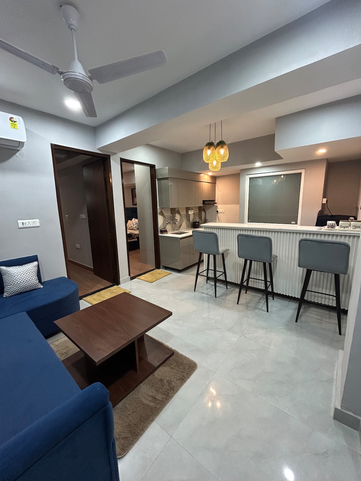 Entrez dans le monde du charme contemporain raffiné. Cet appartement de 525 pieds carrés soigneusement conçu offre un mélange fluide de style et de fonctionnalité, parfait pour les voyageurs et les professionnels qui cherchent à séjourner dans un endroit près de l'aéroport. Emplacement et accessibilité : 1. Aéroport IGI : 25 min(environ 19 km). 2. Centre des congrès de Yashobhoomi : 20 min(environ 12 km). 3. Station de métro Dwarka Sector 21: 15 min (environ 9 km). 4. Gare ferroviaire de Gurgaon : à 20 minutes en voiture (environ 12 km).