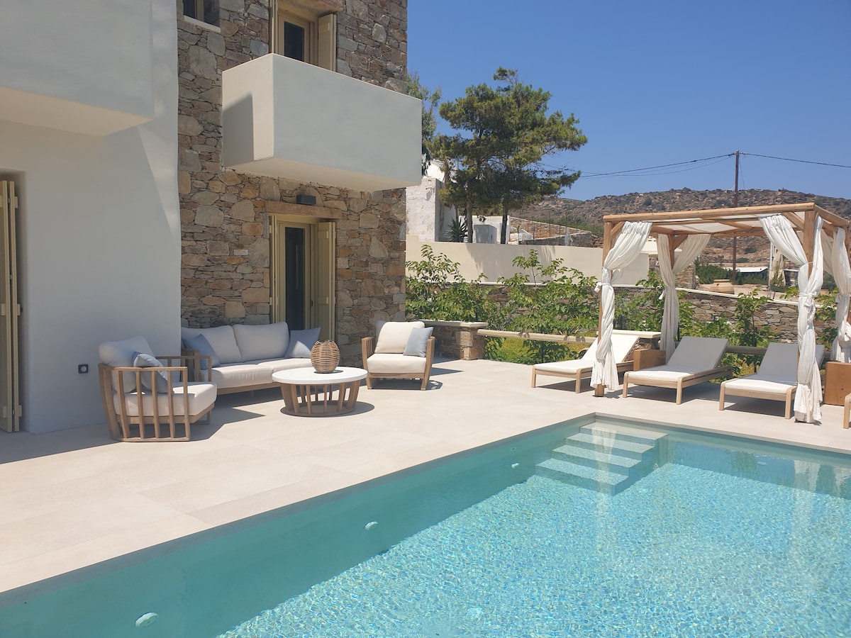 Maison en pierre du complexe de maisons en pierre Agiannirema, avec piscine privée avec chaises longues et poufs uniques pour des vacances dans la nature près d'une plage de sable. Il se compose d'une chambre avec un lit double et d'un salon avec deux canapés-lits intégrés et une cuisine entièrement équipée. Elle est idéale pour les familles, mais aussi pour les couples qui veulent des vacances reposantes avec confort et luxe dans un environnement naturel fantastique.