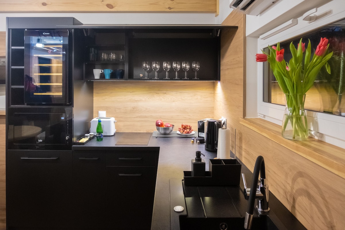 Nous invitons nos voyageurs dans une grange moderne. Le chalet est entièrement équipé et prêt à accueillir quatre personnes. En réservant l'un de nos chalets, vous bénéficiez d'un accès de 2 heures à un espace spa privé pour chaque jour de votre séjour. Notre SPA a été créé pour le repos, la proximité et l'intimité totale. Nous vous accueillons chaleureusement avec du vin rouge, du café (Nespresso), du thé, de l’eau et des sucreries :)
