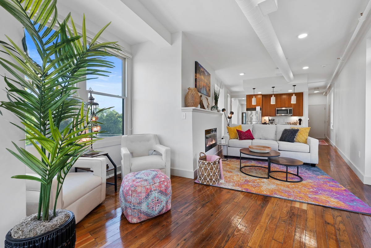 Style loft, unité au niveau de la rue en face du marché historique de Findlay. Arrêt 12 sur le Cincinnati Bell Connector *GRATUIT*. Capacité d'accueil de 6 personnes. 1 lit King Size dans le loft, 1 lit Murphy pleine grandeur et 1 canapé-lit Queen Size, parfait pour les familles ! À distance de marche de tous les meilleurs endroits d'OTR, ou profitez de la cuisine complète et du shopping au Findlay Market. Un mur de fenêtres remplit l'unité de lumière naturelle tandis que Solar Tint maintient l'intimité et que le film 3M assure la sécurité.