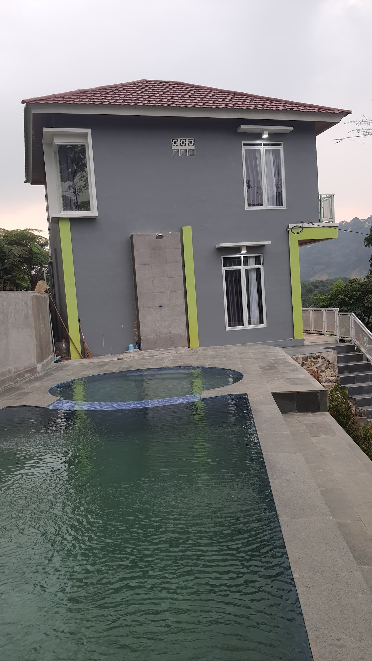 Grey House est une villa située à Cijeruk Bogor (sans circulation et même sans impairs). Villa au design esthétique d'une capacité de 6 personnes (max. 8) avec le concept de studio mezzanine (pas de chambre), piscine privée, cuisine semi-extérieure et piscine publique. Villa avec toutes les commodités telles que la climatisation, le chauffe-eau, le distributeur, le réfrigérateur, le cuiseur à riz, la télévision intelligente, le Wifi, le karaoké, les fournitures de cuisine et de restauration simples. Cette villa est parfaite pour des vacances en famille