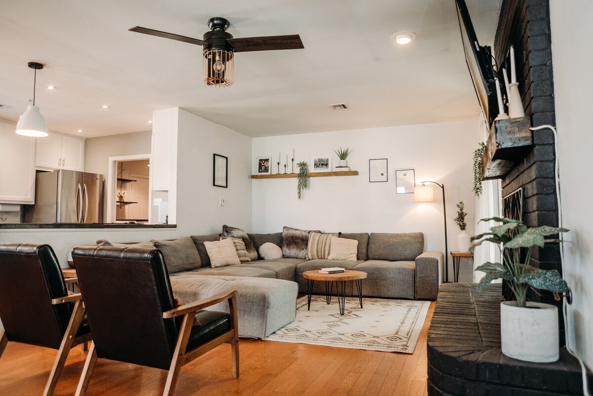 Conçu pour avoir tous les extras d'un hôtel de qualité, mais avec la sensation et l'espace d'un logement. C'est votre logement pour le confort, la détente et le plaisir ! Situé dans un coin de quartier familial, ce logement dispose d'une cuisine complète, de deux patios et d'une cour arrière entièrement fermée. Le brasero et les s'mores gratuits sont également à vous, dans cette belle maison confortable.