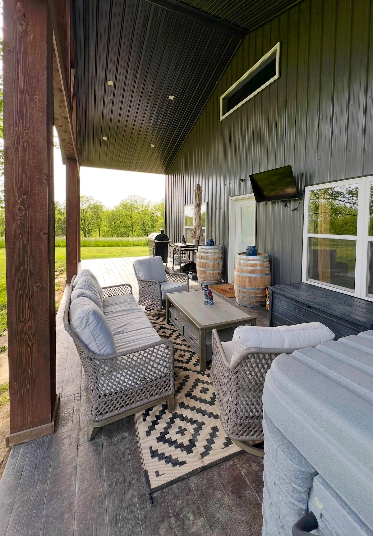O's Barn Cabin offre une façon simple et unique de se détendre de manière rustique ! Notre petite maison acceptant les animaux de compagnie est de 532 pieds carrés d'espace ouvert et de caractère de campagne. L'emplacement est hors de la ville, mais à seulement quelques kilomètres de tous les magasins dont vous avez besoin. La petite cabane est nichée dans notre allée privée et paisible partagée, avec vue sur le bétail au pâturage juste à côté du porche avant au bon moment de l'année. Notre projecteur grand écran et notre foyer sont deux équipements que vous ne manquerez pas d'apprécier !