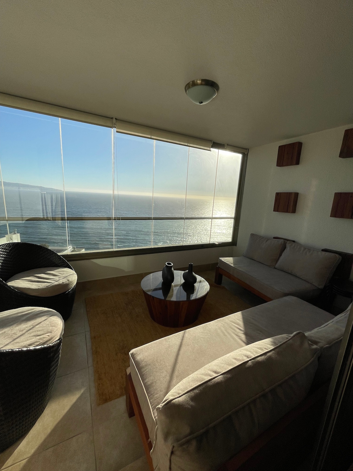 Lindo departamento con terraza vista al mar, un dormitorio un baño, completamente amoblado y equipado. Cuenta con wifi y cable para la tv smart de 42 pulgadas. Excelente iluminación. Edificio cuenta con consejería 24 hrs, 2 piscinas: exterior y temperada, gimnasio, sauna, quincho, lavandería y estacionamiento. Se encuentra cerca de supermercados, bencineras, farmacias. Ubicado a 5 minutos de la playa en auto, y 20 minutos a pie. Se ofrece descuento del 10% a estadías mayores a 7 días.