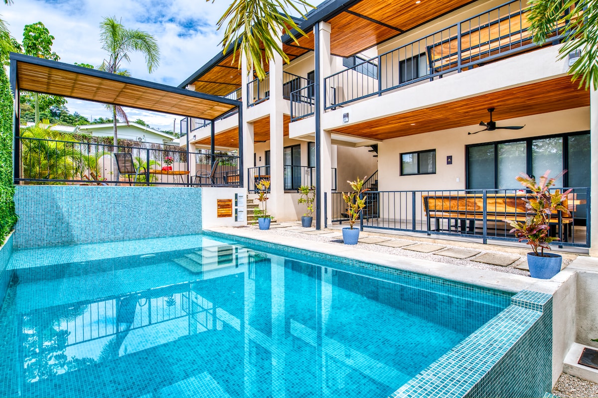 **RÉCEMMENT RÉNOVÉ** Détendez-vous dans cette oasis espagnole moderne et tranquille que toute la famille appréciera. Pueblo Colonial est une communauté fermée à distance de marche des boutiques, des restaurants et de la plage de Tamarindo, mais le quartier est paisible et isolé. Détendez-vous sur le patio avant caché par les jardins luxuriants où vous pouvez entendre la cascade de notre belle piscine qui est à quelques pas. Notre personnel sur place est prêt à vous aider pour tout ce dont vous pourriez avoir besoin. Parfait pour 2 adultes/2 enfants ou 2 couples.