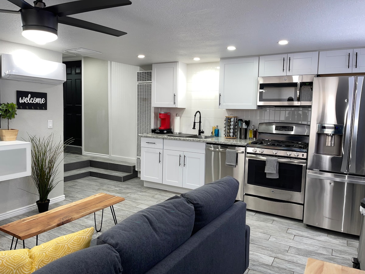 EMPLACEMENT EMPLACEMENT EMPLACEMENT ! ! ! Ce studio confortable est parfait pour une escapade romantique à Sedona! C'est le chalet parfait pour célébrer le temps passé ensemble. Idéal aussi pour les voyageurs en solo. Votre patio personnel comprend des fauteuils, un foyer, un grand parasol et un barbecue pour des expériences en plein air inoubliables! Également situé au centre des sentiers de randonnée pédestre et cyclable, des magasins, des restaurants, des dégustations de vin, des brasseries locales, de la musique live et plus encore ! TPT# 21306116 Permis n ° 005792