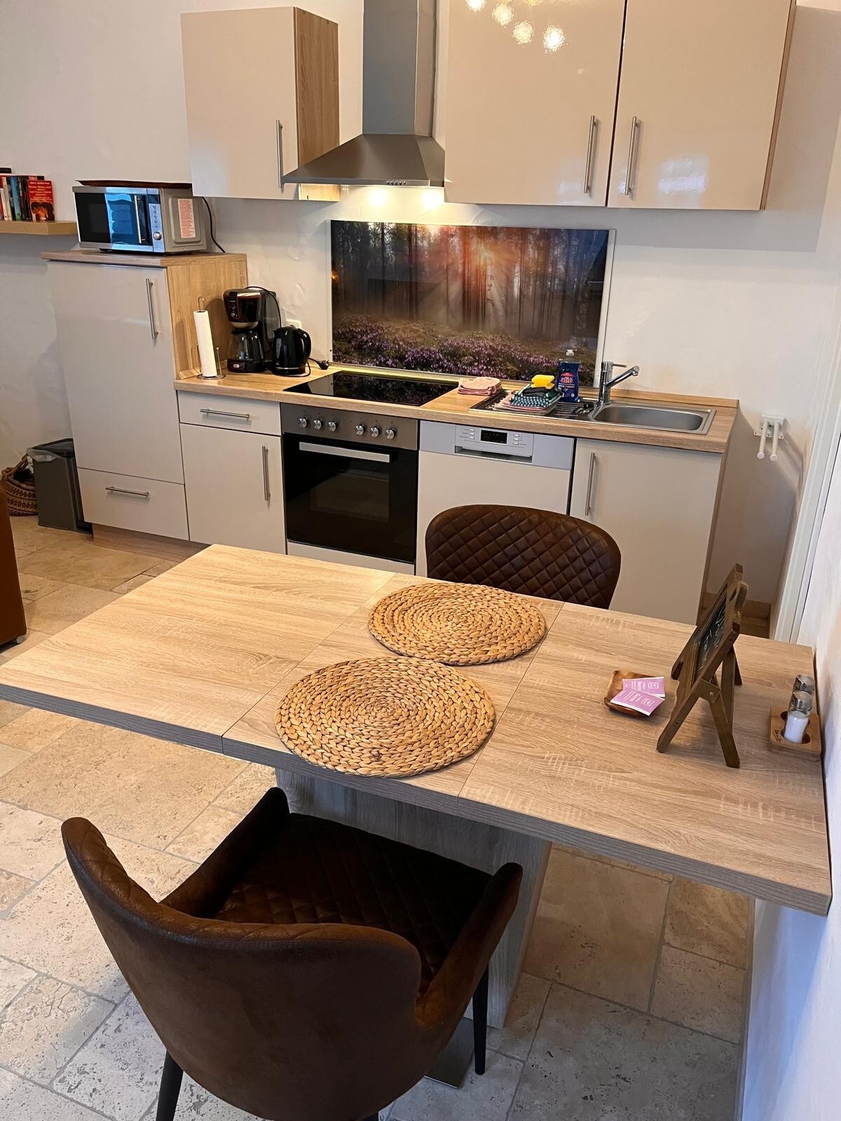 Un appartement indépendant très central d'environ 55 m², avec entrée indépendante. L'appartement dispose de deux chambres à coucher verrouillables avec des stores électriques extérieurs, une cuisine-séjour ouverte avec un canapé-lit et une salle de bain. La cuisine avec plaque à induction est entièrement équipée. Idéal pour cuisiner, vivre et se détendre. Une terrasse est également aménagée au niveau du sol depuis le salon. Il est possible de se garer directement sur le parking privé devant l'entrée. Il y a d'autres places de parking le long de la rue.