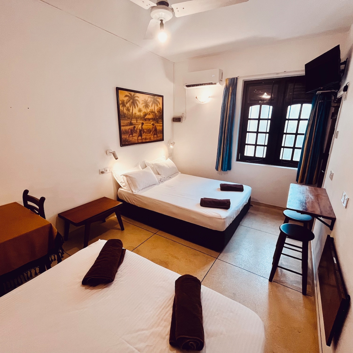 Chambre spacieuse et climatisée avec salle de bain attenante située à l'étage supérieur de notre maison. Le logement est accessible par un seul escalier large. Dispose de deux lits (avec l'option d'un 3ème), d'armoires murales, d'une armoire, d'un évier, d'une grande table qui sert d'espace de travail/table à manger et d'équipements de cuisine. La bibliothèque contient des ouvrages factuels et de fiction et des publications des hôtes sur le Sri Lanka, avec des chaises confortables pour se détendre et lire. Des photographies et des peintures d'artistes sri-lankais ornent les murs.