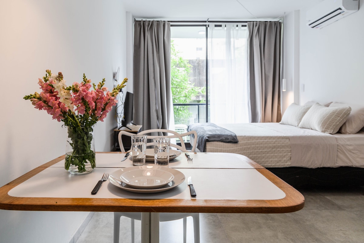 Bienvenido a nuestro loft! Diseñado para que tu estancia en Buenos Aires sea tan eficiente como placentera. Ubicado en un punto clave de la ciudad, contamos con: Conexión y movilidad total: Ganá tiempo valioso. Estamos ubicados a metros de las principales líneas de subte y colectivos. Ideal para el trabajo remoto: Contamos con Wi-Fi de alta velocidad y un ambiente tranquilo y luminoso. Impecable y listo para vos: Te entregamos un espacio reluciente y totalmente equipado.