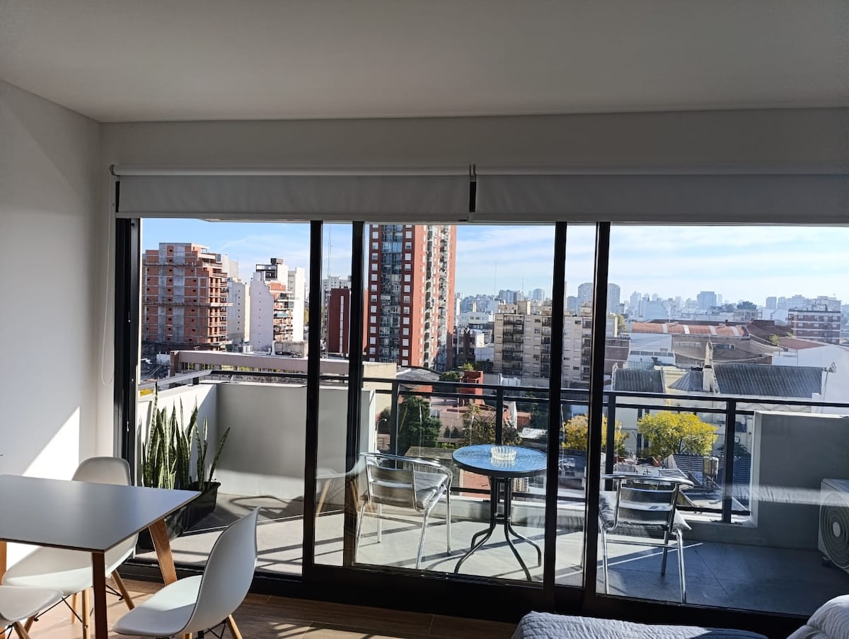 Studio neuf pour 2 personnes, très lumineux et avec un balcon confortable. Cuisine complète, réfrigérateur, climatisation, wifi et TV. Nouveau bâtiment dans le quartier de San Cristobal, à quelques mètres des lignes E et H du métro qui vous relient à toute la ville. TV HD avec service Pluto TV, Netflix et Disney+. À proximité de : - Hôpital Ramos Mejia - Hôpital Cesar Milstein - Fondation Favaloro - Faculté de psychologie UBA