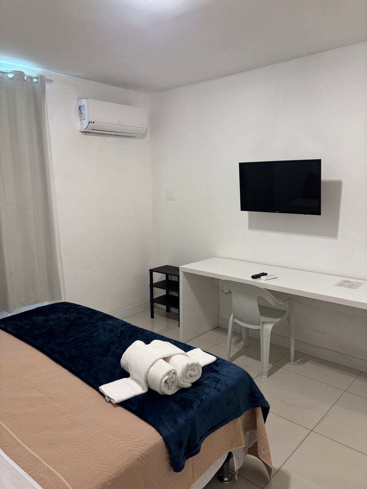 Loft charmant, moderne et complet. Wi-Fi, climatisation, télévision connectée, réfrigérateur, serviettes, literie, mini lit, four électrique, mixeur, four à micro-ondes, machine à sandwich et tous les ustensiles d'une maison, vous n'avez rien à apporter. Le bâtiment dispose d'un concierge 24h/24, d'un ascenseur et d'un confort 24h/24. Situé sur Presidente Vargas Avenue, l'une des principales de la ville. À 50 mètres des principaux moyens de transport (métro, VLT et train). À 10 minutes de la gare routière et de l'aéroport.