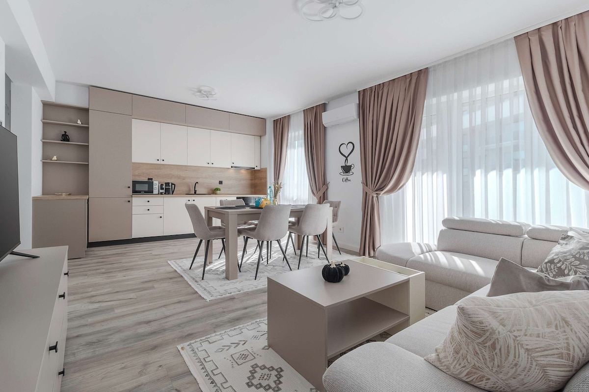 Nous vous invitons à découvrir un appartement moderne, parfait pour un séjour relaxant ou productif. Cet espace est idéal pour les couples, les voyageurs d'affaires ou les petites familles. Il comprend un salon lumineux et accueillant, une cuisine entièrement équipée, une chambre relaxante et une salle de bain élégante. Le balcon offre un espace de détente. Avec un excellent emplacement, à seulement 4 minutes à pied de la place Unirii, vous serez à proximité des principales attractions, restaurants et transports en commun de la ville.