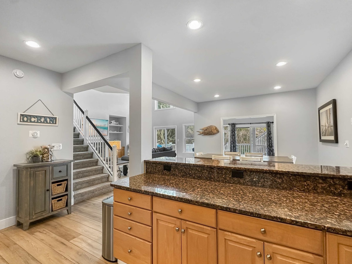 Maison de plage étincelante et rénovée de 4 chambres/3 salles de bain, une cabane dans les arbres de 2500 pieds carrés qui prend vie avec 6 terrasses, cuisine de chef avec aménagement ouvert et plafonds de 20 pieds, piscine privée (chauffage en option) avec barbecue à gaz, porche et jacuzzi supérieur pour observer les étoiles. Salle de bain de type spa avec baignoire profonde et cheminée. De superbes plages et la pittoresque jetée au coucher du soleil ne sont qu'à quelques pas ou à quelques minutes à vélo. Idéalement situé à quelques minutes des commerces, restaurants et attractions tout en conservant la solitude de Corolla.