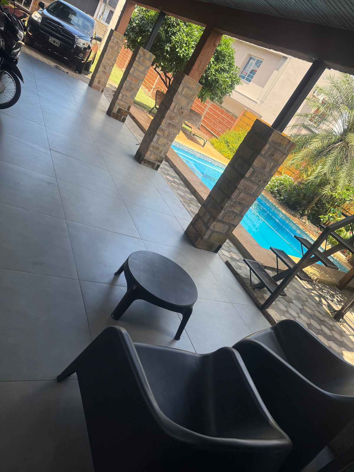 Maison confortable, spacieuse, grande cuisine, salon, petites cours intérieures et une au plus grand fond. Deux chambres avec lits simples. Cour arrière avec barbecue et table de ping pong. Salon loin de la salle à manger. Salle de bain principale près des chambres. Une autre salle de bain auxiliaire sans douche et sans bidet est disponible à proximité des chambres. Troisième salle de bain supplémentaire dans la cour arrière, sans douche ni bidet. Garage intérieur.
