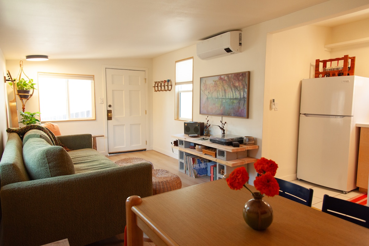 Slip into a quiet, private stay that feels tucked away yet close to everything. This cozy space is designed for rest, simplicity, and easy evenings after a full day out. - Queen bed with Nectar mattress - Wifi and 75” Smart 4K TV - Full Bathroom, Kitchenette and Dining - Central heating & cooling (shared system) - EV charger (220V) available on request - Located near the 405 and 55 freeways - 20 minutes to Disneyland - 10 minutes to the beach and shops Feels easy to arrive—and easy to stay!