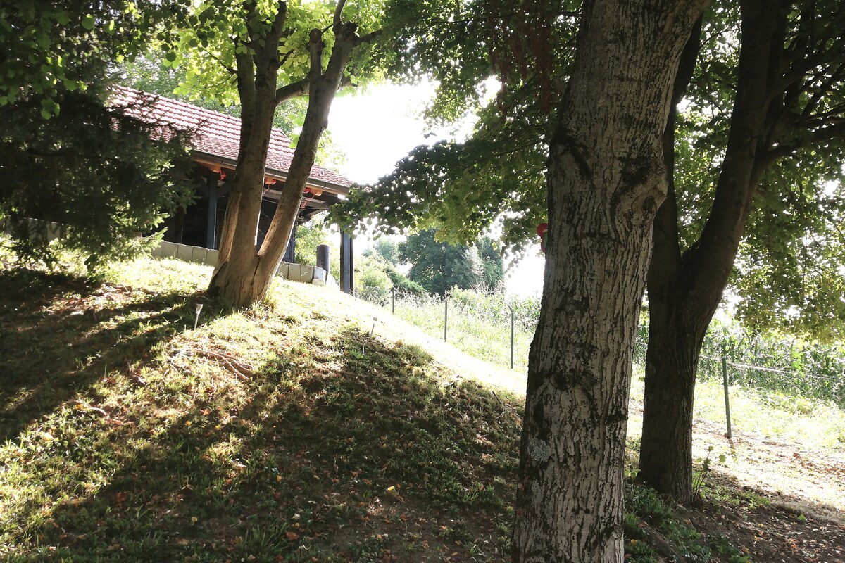 Un chalet de bois, décoré de façon moderne avec des détails de tradition. Découvrez les avantages de la vie moderne (wi-fi, climatisation, télévision, appareils électroménagers…) en même temps au milieu des vignobles et des vergers (à entretenir, alors attendez-vous à quelques vignobles en voyage d'affaires et ne le prenez pas pour le mauvais bruit occasionnel). Faites une pause sur une terrasse spacieuse surplombant la vallée de la rivière Sutle, faites une promenade dans les environs, jetez un coup d'œil dans l'argile, profitez de la nature (une rencontre avec quelques habitants de cette nature est inévitable).