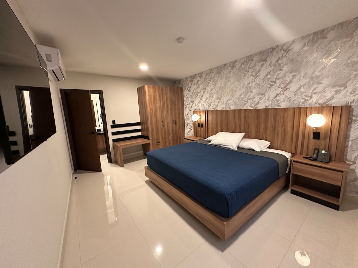 Habitación amplia con cama King Size, ideal para estancias de trabajo o descanso. Ubicada en el corazón de Culiacán, a solo 2 calles de la principal avenida, estarás cerca de todo: restaurantes, bares, bancos, tiendas y el mercado donde encontrarás productos locales. Contamos con internet TV, recepción 24 horas y estacionamiento privado para tu comodidad y seguridad. Su excelente ubicación te permitirá desplazarte fácilmente por la ciudad ¡Tu estancia perfecta te espera aquí!