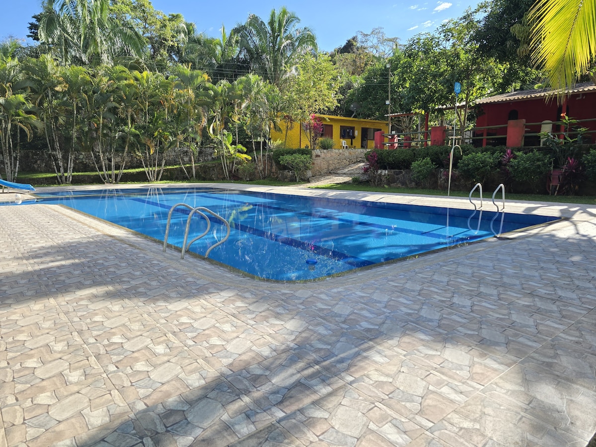 Espace naturel, idéal pour se connecter avec la nature tropicale et réussir à passer quelques jours de repos. Situé à la périphérie du village, à proximité Los Medios del Carmen de Apicalá Departamento del Tolima. Il est situé à 2,5 km du village. Capacité pour 13 personnes en lit, piscine privée, espace camping, hamacs, douches privées, salle de bain privée, espace vert, salon et salle à manger, cuisine indépendante, coin linge, lave-linge, réfrigérateur, environnement naturel. De plus, nous avons un service de wi fi