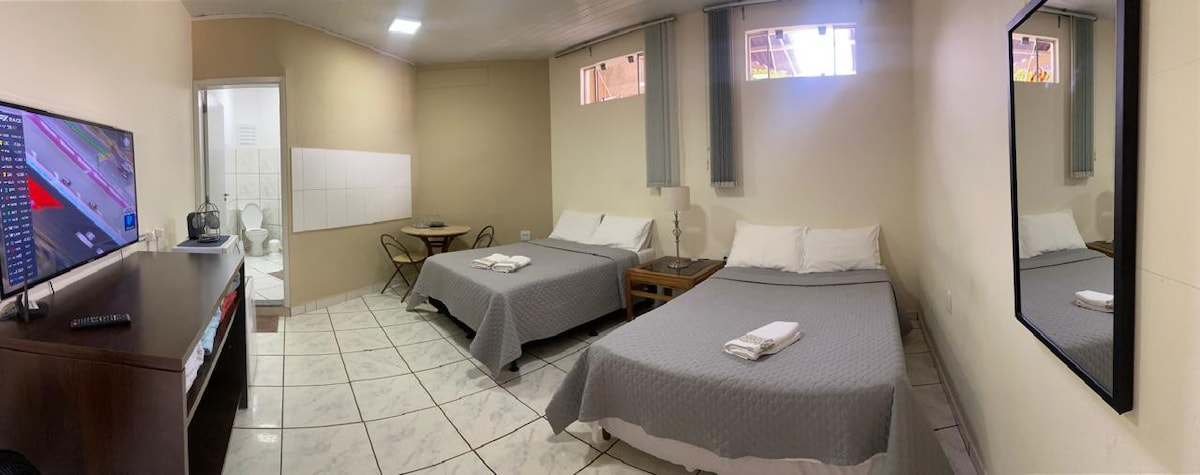 1 quarto de casal com sacada, 1 banheiro privativo, cozinha americana com itens básicos e 1 sofá cama, lavanderia compartilhada, ferro de passar, TV com aplicativo e wi-fi.