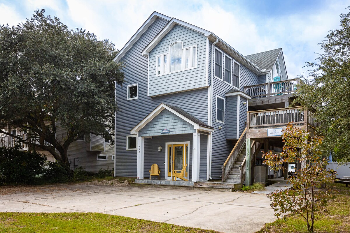 Chalet magnifiquement décoré et confortable avec TOUS les équipements de plage que vous pourriez désirer : chaises, bouées, vélos, chariot roulant, boogie boards, kayak, jouets de plage, gril, etc. Accès privé à la plage au bord de l'océan à quelques maisons seulement, demi-terrain de basket, Wi-Fi, stationnement gratuit, accès aux pistes cyclables et aux commerces à proximité, kayak, belles vues et plus encore ! Duck, NC est la partie la plus parfaite des OBX pour les vacances !