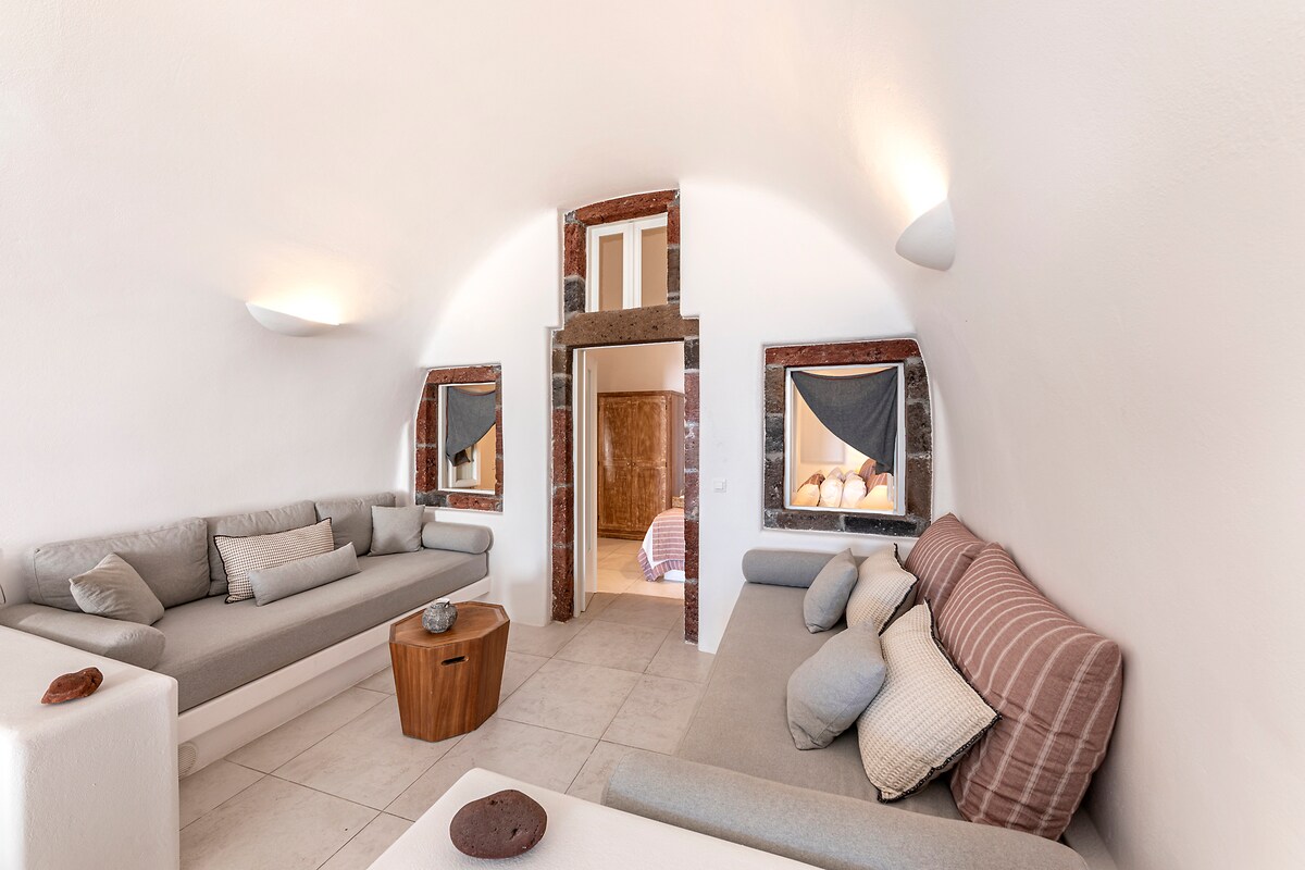 La grotte d'Antron est située au centre du magnifique village traditionnel d'Akrotiri! C'est une maison troglodyte exceptionnelle et entièrement rénovée du siècle dernier qui peut couvrir tous les besoins des clients! Dans sa cour privée, vous trouverez un jacuzzi extérieur étonnant, d'où vous pourrez vous détendre et profiter de la vue sur la caldeira! Il y a aussi une douche extérieure ! La maison dispose d'une cuisine entièrement équipée, d'un canapé pour se détendre, d'une table à manger et d'un joli lit construit pour profiter de votre sommeil !