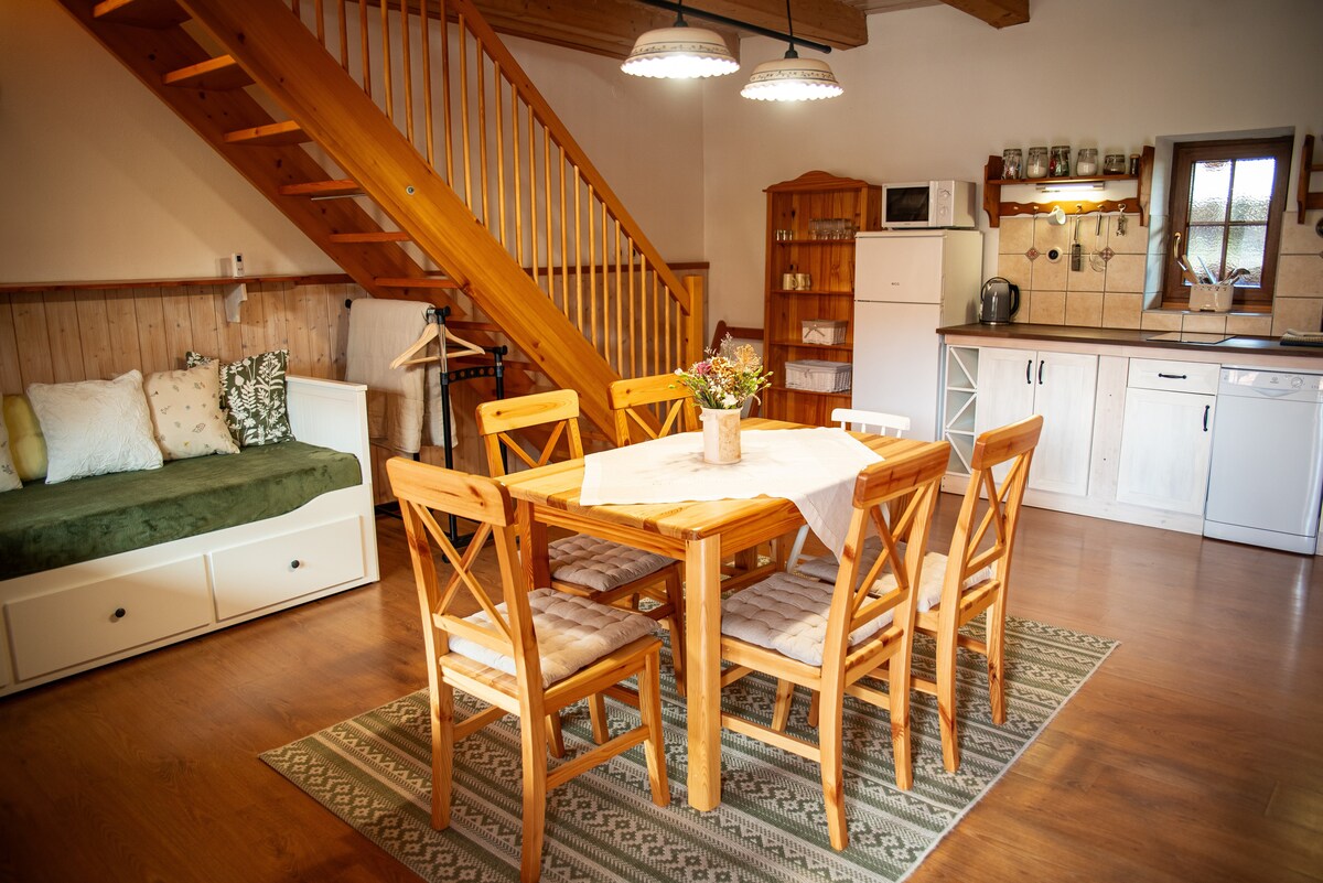 Nous proposons un logement dans un chalet, situé à la périphérie du pittoresque village Horní Lhotice à proximité de Kralice nad Oslavou. Le chalet est entièrement équipé et dispose de 3 lits doubles et de 3 lits simples dans trois chambres. Deux chambres à coucher à l'étage. Les escaliers sont légèrement plus raides. Une des chambres supérieures est reliée à une pièce commune par une galerie. Il y a également une cuisine, une salle de bain avec WC dans la maison. Les voyageurs sont fournis avec le coin salon extérieur avec une cheminée.